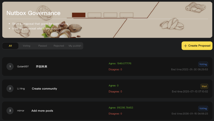 The Web3 community can create their own Governance modules on Nutbox just like Snapshot. Once the Governance of the community is created, community users can initiate proposals to decentralize the management of the community management or DAO Fund.